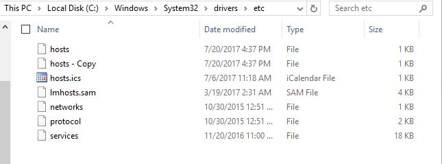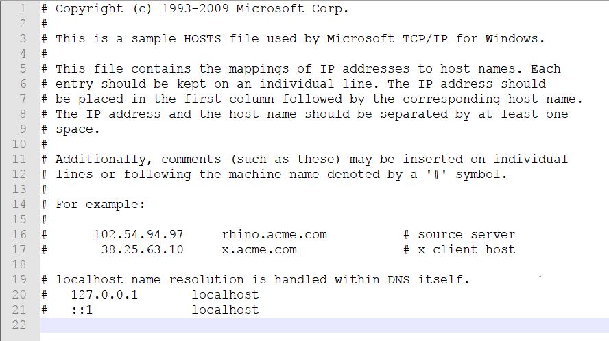 - Go to Windows\System32\drivers\etc folder and open hosts file using a text editor. (Again, backup the original file before editing)