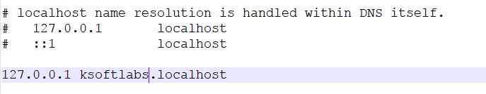 - Add 127.0.0.1 <Space><Virtual Host Name> to the bottom of the file and save it. You may have to give administrative privileges to save.