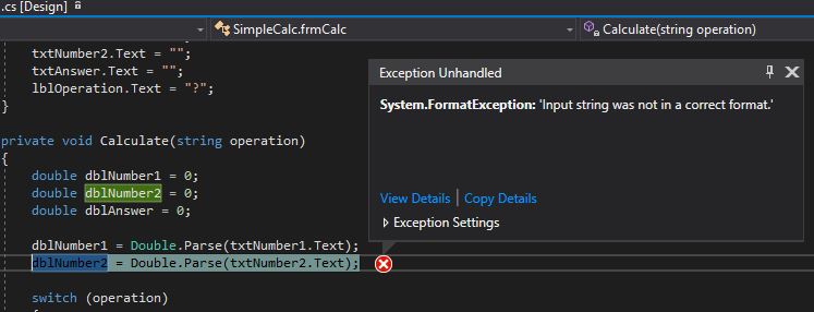 dblNumber1 = Double.Parse(txtNumber1.Text); dblNumber2 = Double.Parse(txtNumber2.Text);