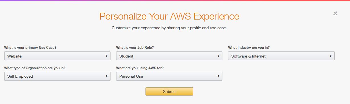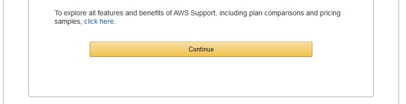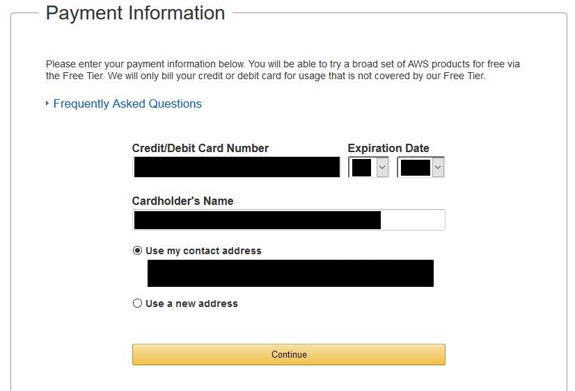 Enter your credit/debit card information and click continue. (Note : You will not be charged for AWS products provided in the Free Tier)